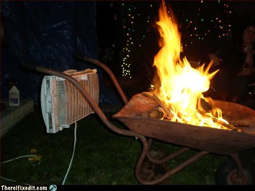 Using wheelbarrow as fire pit.